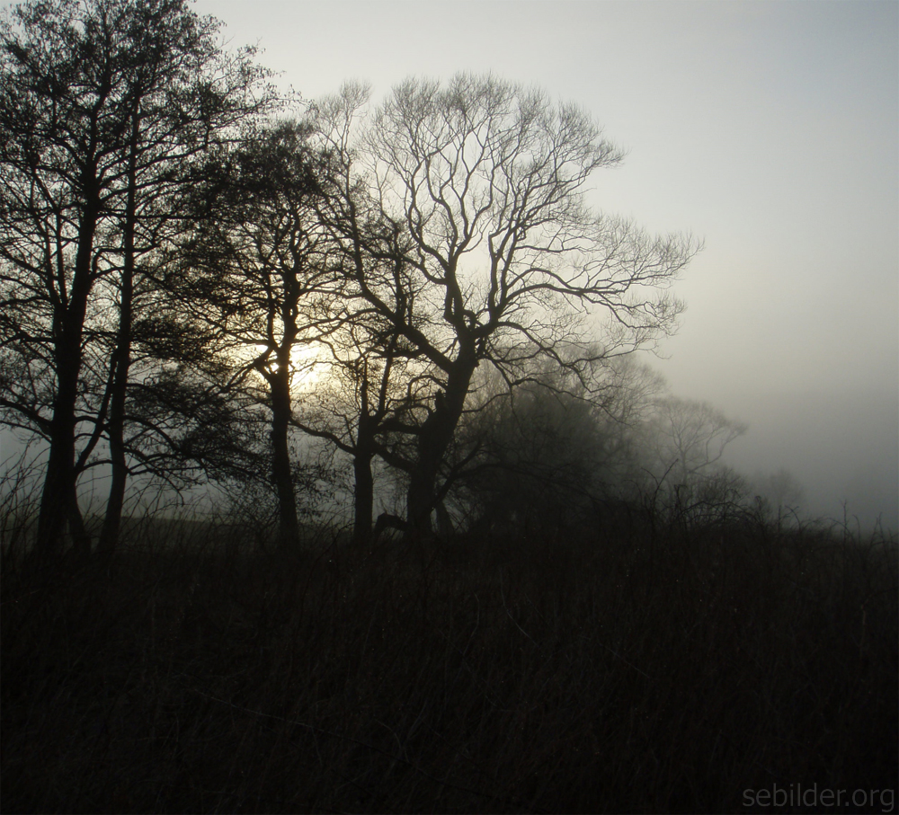 Vackert foto med solen som försöker bryta igenom dimman och trädsilhuetterna.