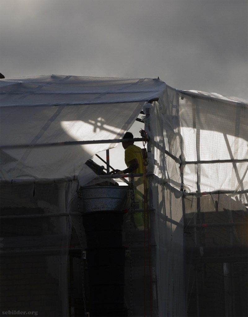 Jag tycker det är trevligt att se folk jobba (jobba ihop till min pension, bland annat). Det var min första tanke. Den andra är att det här kanske är en underbetald och hårt jagad lettisk eller polsk byggnadsarbetare som borde ha bättre anställningsförhållanden. Vad vet man? – Trevlig helg i alla fall, efter detta lilla filosoferande!