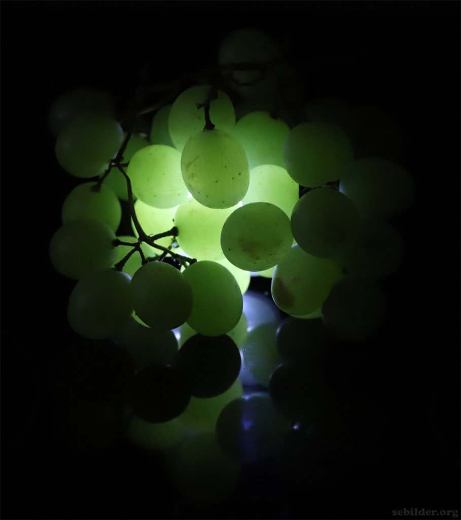 De blå är inga vindruvor. Det är ljuskällan under druvorna som reflekteras i underlaget, polerad svart granit – min arbetsbänk i köket.